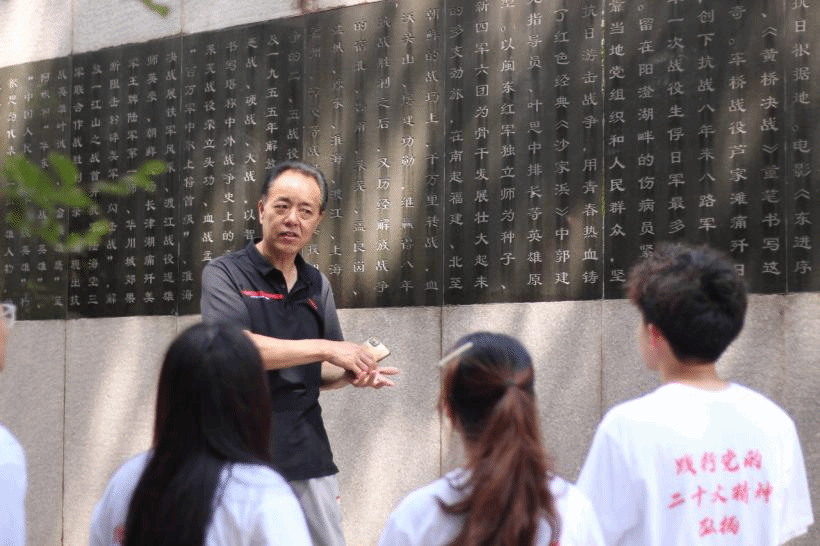 图5 棠口村党总支第一书记张书巡在新四军六团北上抗日纪念碑文前为实践队进行讲解