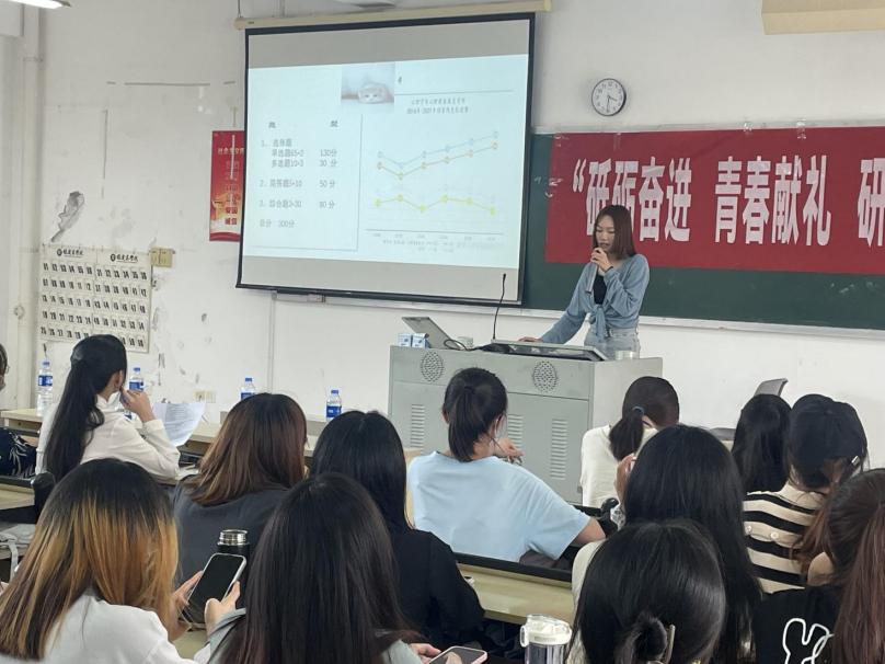 分享会上,7位考研上岸的学姐依次分享经验。学姐们从多个角度为同学们科普了考研的知识,鼓励同学们恰当定位、整理心态、分段学习,并且真心祝愿未来学弟学妹们考研成功。在问答环节,同学们积极踊跃地提问,学姐们热心地答疑解惑。同学们深受鼓舞、精神饱满,整个分享会现场激情洋溢,振奋人心。