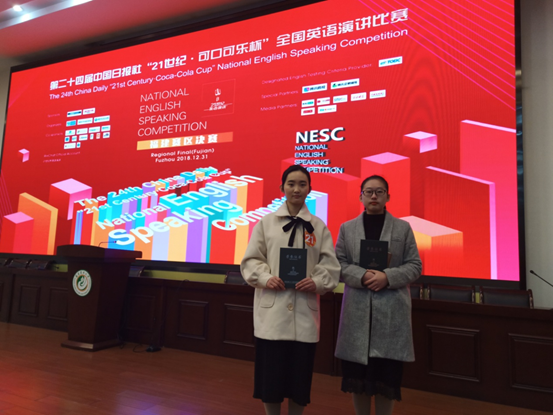 12月31日,第24届中国日报社“21世纪.可口可乐杯”全国英语演讲比赛福建赛区决赛在福建农林大学落下帷幕。经过激烈比拼,我校外语系17商务英语1班黄琳同学荣获二等奖(指导老师:谢玉容)、17商务英语3班朱吴钰同学荣获三等奖(指导教师:姚剑平)。