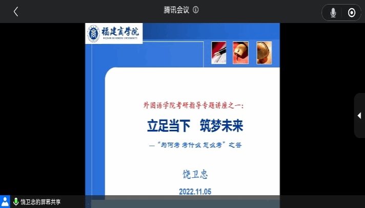 为帮助同学们做好考研规划,明确考研目标,2022年11月5日,BV伟德官方网站于聚贤楼411会议室开展以“立足当下,筑梦未来”为主题的考研指导专题讲座。本次讲座采用线上与线下相结合的方式,学院副院长饶卫忠老师担任主讲人。