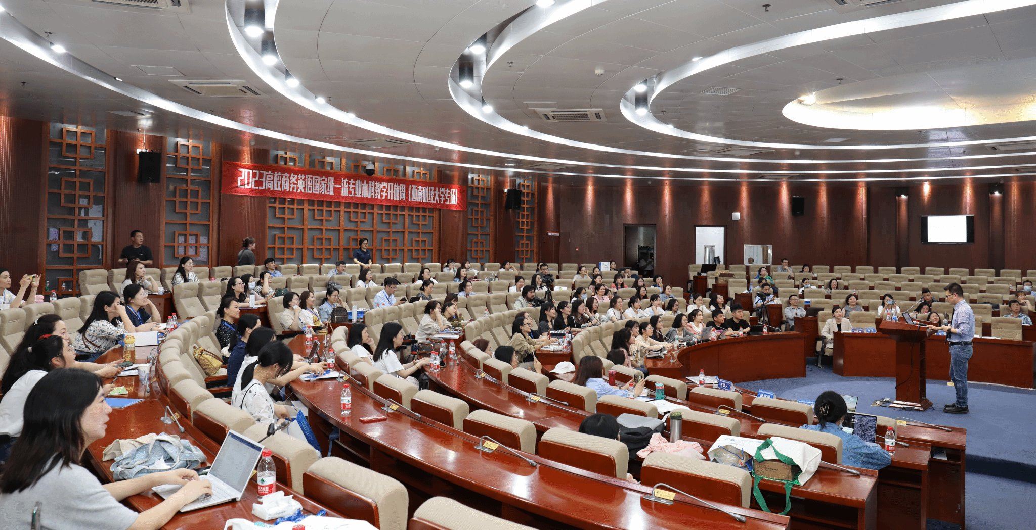 开放周期间,北京语言大学高级翻译学院王立非教授、南昌理工学院副校长翁凤翔教授等国内商务英语著名学者对当前人工智能时代下商务英语教学教法与科研的新方向作出了展望。西南财经大学的优秀教师们通过公开课的形式,生动展示了互动性商务英语课堂与思政内容的创新应用与有效结合,以及该校在商务英语教学和科研工作方面取得的成果。
