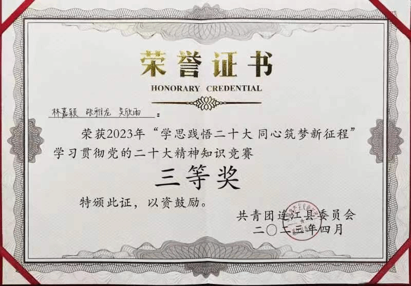 2023年4月25日,由共青团连江县委员会主办,共青团BV伟德官方网站委员会、共青团福州理工学院委员会承办,BV伟德官方网站学生协办2023年的“学思践悟二十大,同心筑梦新征程”学习贯彻党的二十大知识竞赛决赛于连江校区明德楼学生活动中心举行。由BV伟德官方网站20级商务英语3班张雅龙,21级商务英语2班林嘉颖,21级日语1班吴欣雨三位同学组成的BV伟德官方网站第一代表队在竞赛中沉着冷静、协助作答,最终荣获三等奖的好成绩。